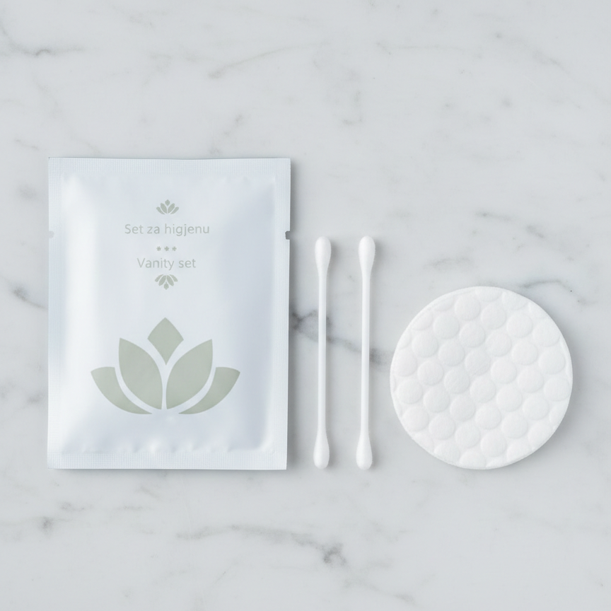 Zamislite zadovoljstvo vaših gostiju kada u kupatilu pronađu savršeno upakovan higijenski set koji sadrži sve što im može zatrebati tokom boravka. Male, pažljivo odabrane sitnice čine veliku razliku, a ovaj set je osmišljen da upotpuni svaki boravak i ostavi nezaboravan utisak. Naš set sadrži: