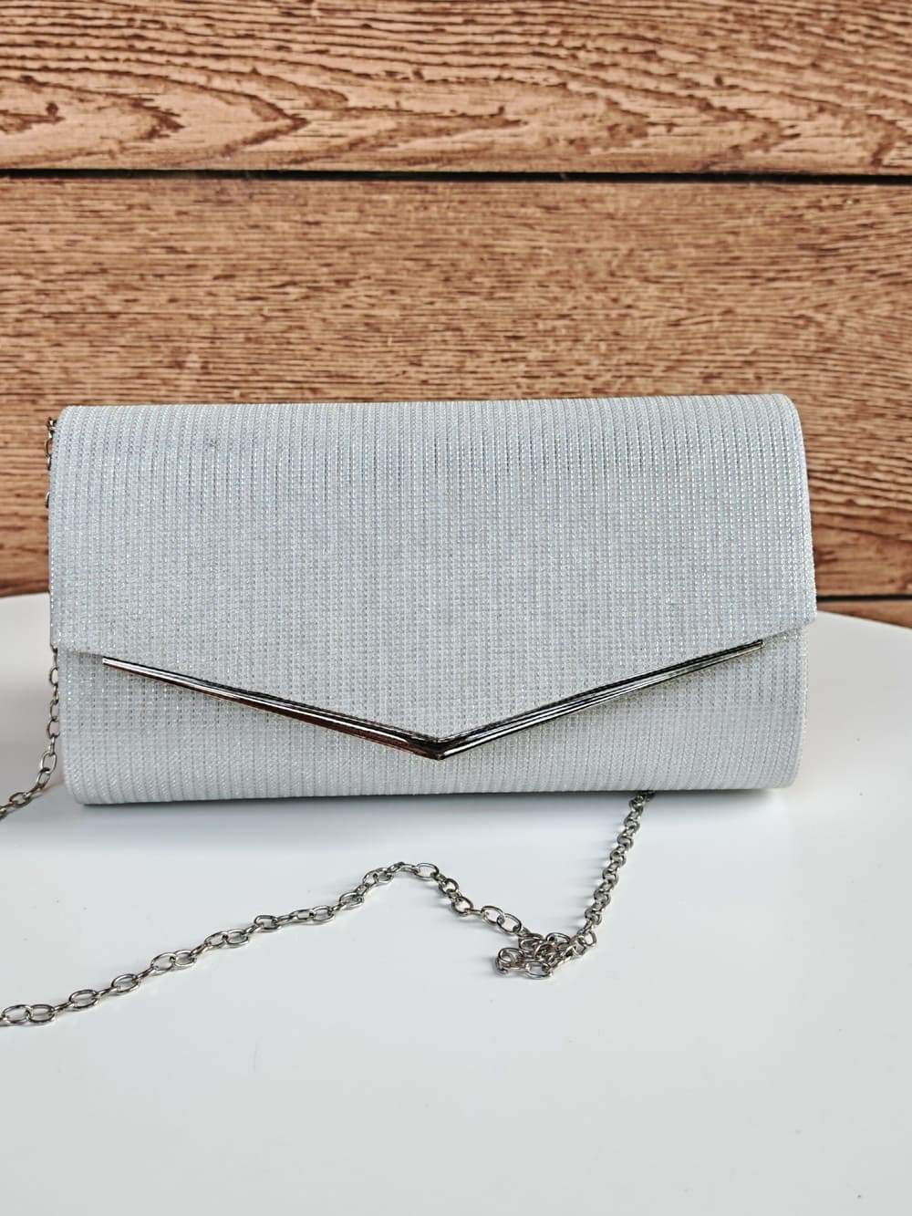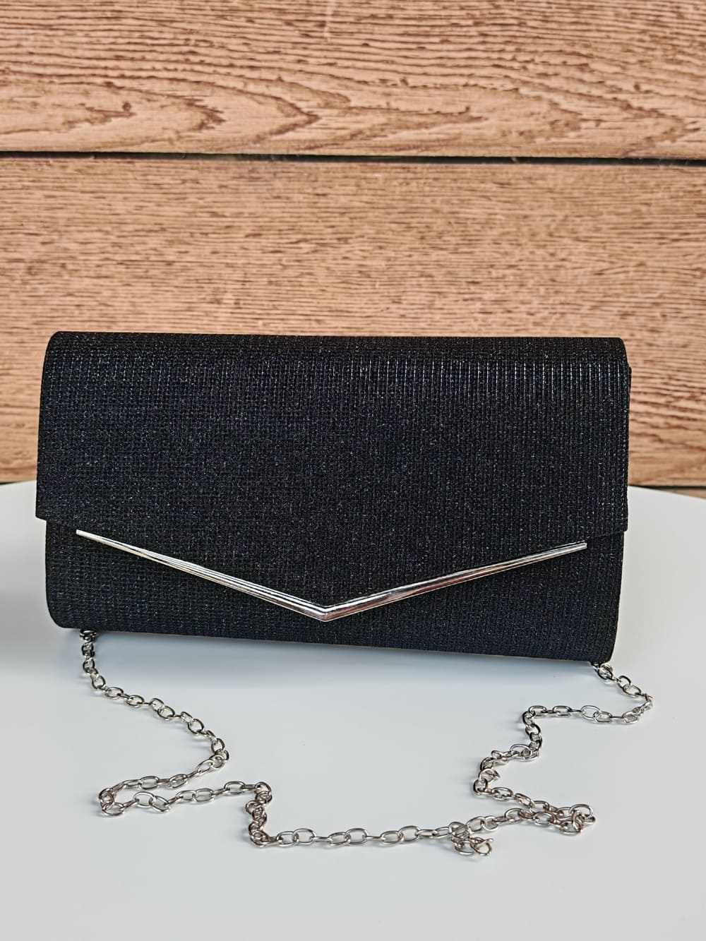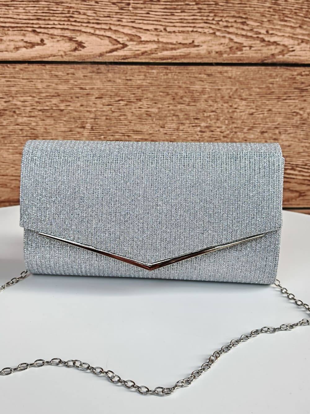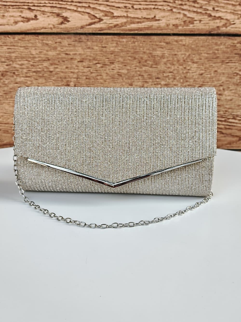 Ova sofisticirana pismo-tašna kombinuje minimalistički dizajn sa maksimalnim efektom. Izrađena od svetlucavog teksturiranog materijala, sa prepoznatljivim V-metalnim detaljem na poklopcu, idealna je za svečane prilike, koktel zabave i večernje izlaske.