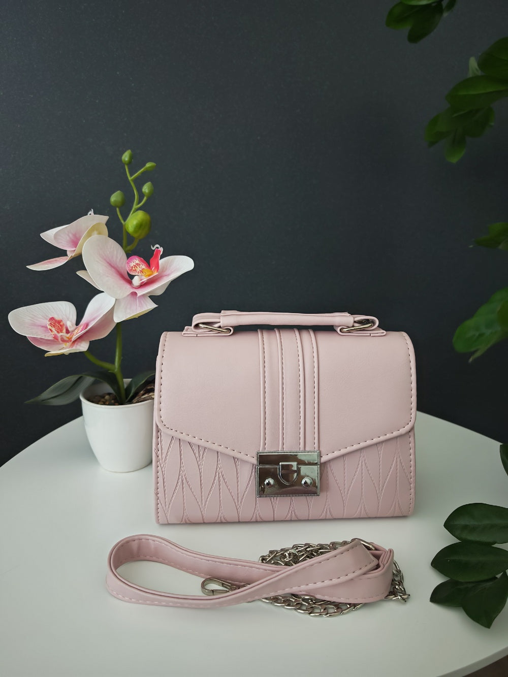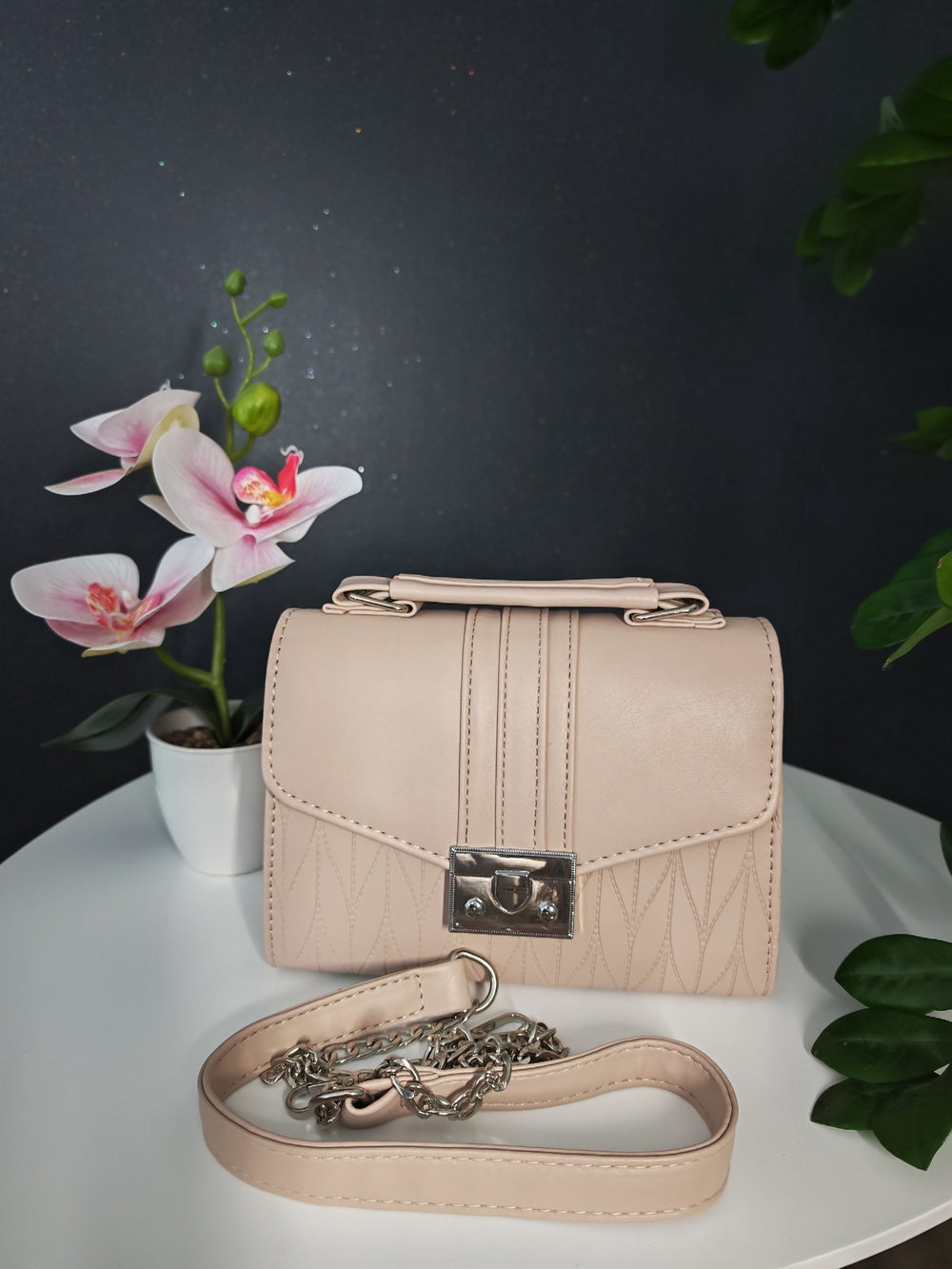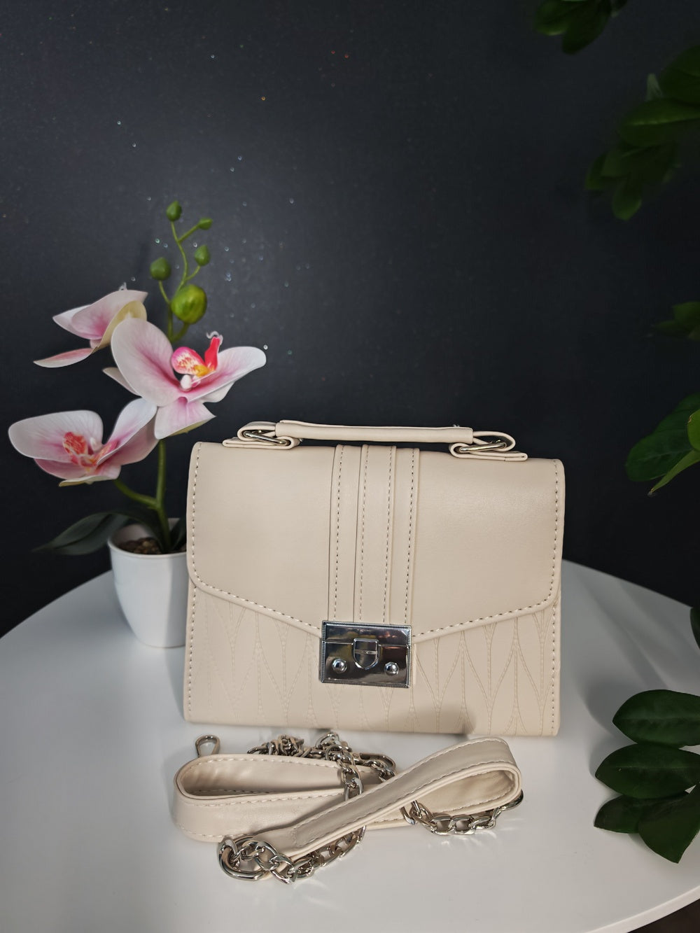 Šta čini Lunu posebnom? Spoj klasične forme i modernih detalja. Horizontalne, reljefne pruge na prednjoj strani daju joj jedinstvenu teksturu, dok sjajni metalni detalji dodaju notu luksuza. Ručka na vrhu omogućava elegantno nošenje u ruci, a odvojivi lanac sa kožnim dodatkom pruža ti slobodu da je nosiš preko ramena.
